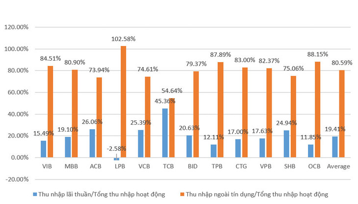 Đáng chú ý, thu nhập của ngành ngân hàng chủ yếu phụ thuộc vào tín dụng, chiếm 70 - 80% tổng thu nhập hoạt động. Thậm chí, có ngân hàng thu nhập lãi thuần từ hoạt động tín dụng chiếm đến gần 90% tổng thu nhập hoạt động. Tuy nhiên, mảng phi tín dụng lại tạo ra tới 45% tổng thu nhập hoạt động cho Techcombank.