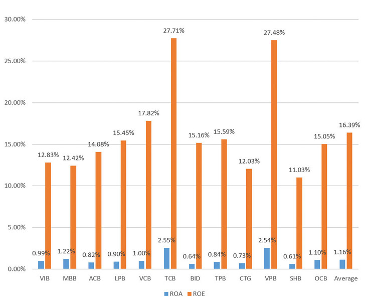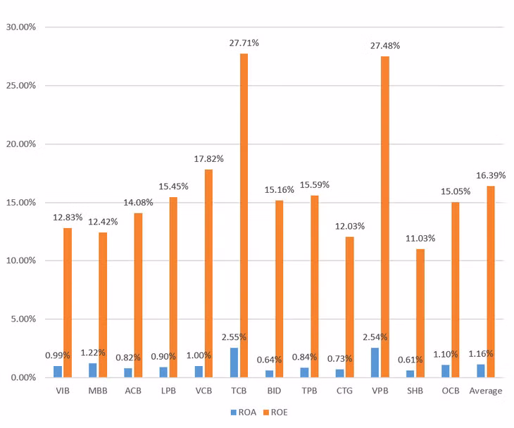 Xét về hiệu quả sinh lời dựa trên hai chỉ số tỷ suất sinh lời trên tài sản (ROA) và tỷ suất sinh lời trên vốn chủ sở hữu (ROE), Techcombank đang là ngân hàng dẫn đầu với số liệu tính toán của Báo Đấu thầu lần lượt là 2,55% và 27,71%, cao hơn cả VPBank và Vietcombank. Chỉ số ROA, ROE của OCB và TPBank cũng cho thấy những tín hiệu khả quan.