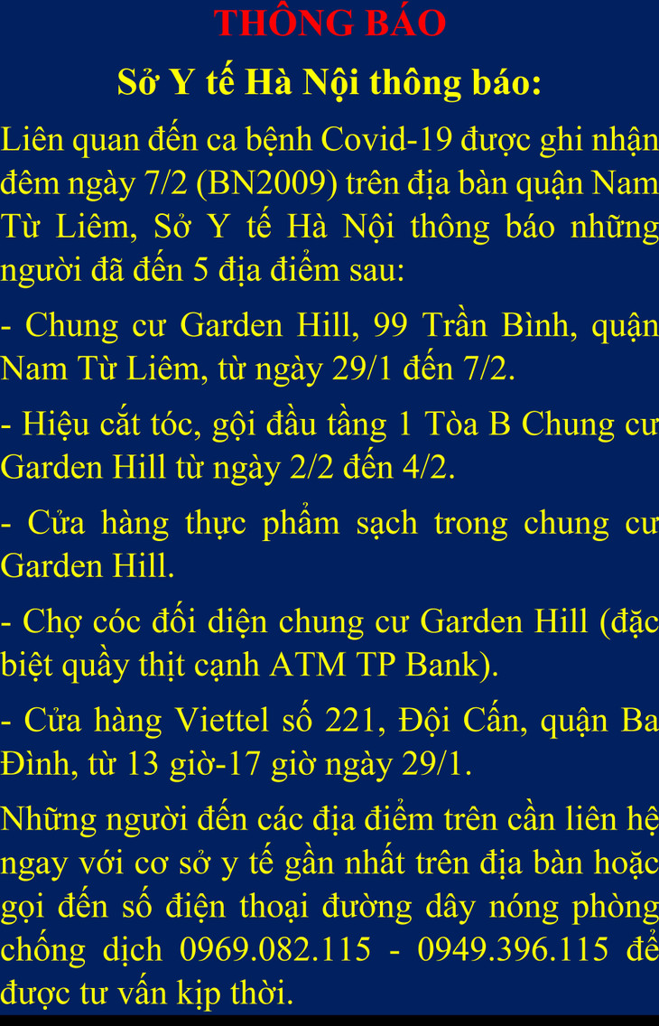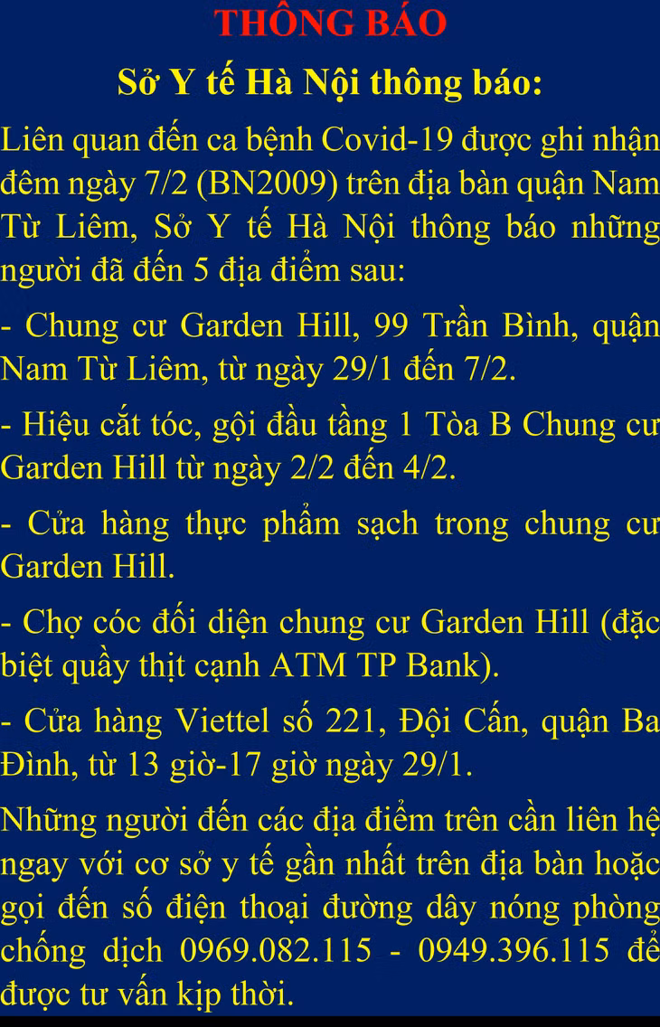 (BĐT) - Liên quan đến ca bệnh BN2009, Sở Y tế Hà Nội thông báo những người đến 5 địa điểm như: Chung cư Garden Hill, hiệu cắt tóc…liên hệ ngay cơ sở y tế để được tư vấn kịp thời.