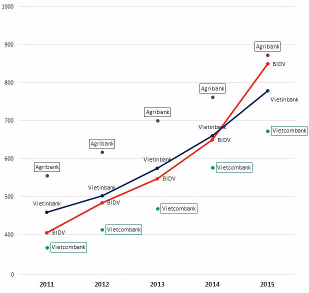 Vietcombank cũng tăng trưởng quy mô mạnh mẽ trong các năm qua nhưng khoảng cách với 3 ngân hàng còn lại vẫn chưa được thu hẹp.