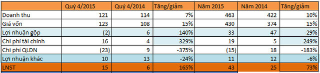Tính riêng quý 4, doanh thu thuần công ty đạt 121 tỷ đồng, tăng 7% so với cùng kỳ, trong đó chủ yếu là doanh thu từ hoạt động xây lắp. Tuy nhiên, giá vốn hàng bán tăng đến 15%, cao hơn doanh thu bán hàng nên cả quý, lợi nhuận gộp từ bán hàng và cũng cấp dịch vụ công ty ghi âm 2,3 tỷ đồng, trong khi cùng kỳ lãi 5,8 tỷ đồng.