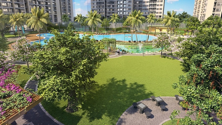 Hàng cây tán lớn được bố trí trải đều khuôn viên với các thảm cỏ xanh mướt, vừa tạo bóng mát đồng thời mở ra không gian tắm nắng, vui chơi thảnh thơi ngày cuối tuần cho cư dân.