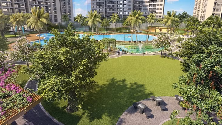 Lấy đa sắc xanh làm chủ đạo, hồ bơi rộng tới 1.000m2 – diện tích lớn gần bằng hồ bơi tiêu chuẩn Olympic nối liền với hồ cảnh quan nghệ thuật, tạo ra điểm nhấn đặc biệt cho khuôn viên. Chạy quanh bể bơi là hàng dừa, cây bóng mát mang đậm hơi thở nhiệt đới, tràn ngập khí trời trong trẻo. Hệ thống tiểu cảnh trang trí, các chòi nghỉ, ghế nghỉ đan xen bể bơi độc đáo biến công viên nội khu tại các thiên đường nghỉ dưỡng.