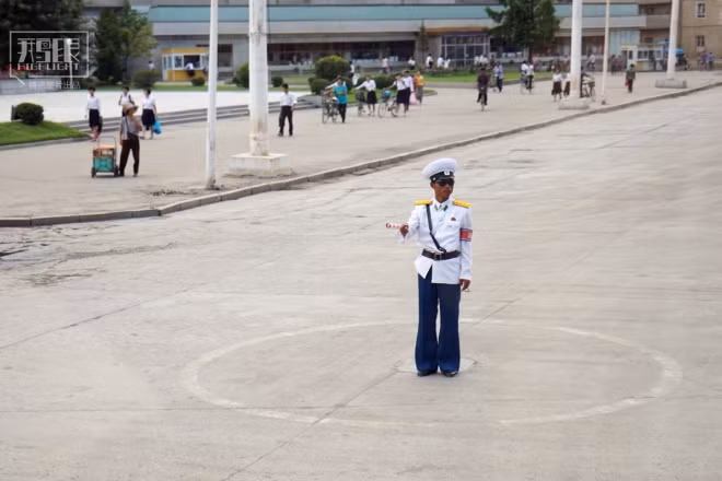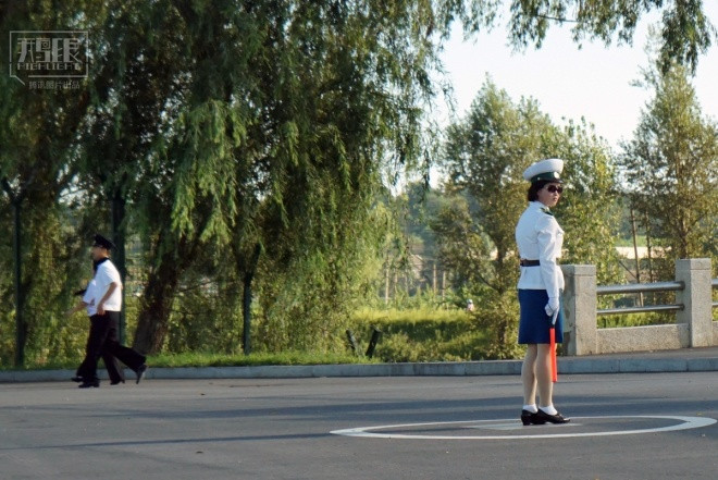 Một nữ cảnh sát giao thông ở Bình Nhưỡng, thủ đô Triều Tiên, đứng gác trang nghiêm bên đường, tay cầm gậy chỉ huy.