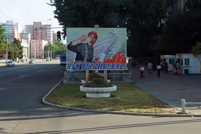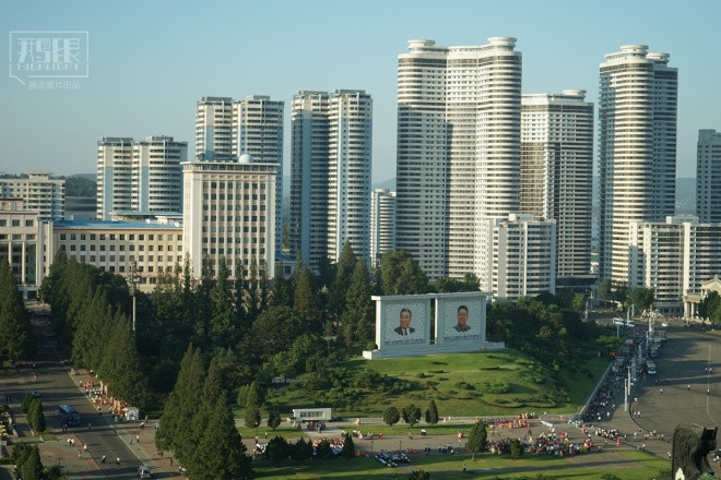 Trong nội thành thủ đô Bình Nhưỡng, nhà cao tầng mọc san sát, đường phố rộng rãi, sạch sẽ, khắp nơi treo tranh tuyên truyền và hình các lãnh đạo.