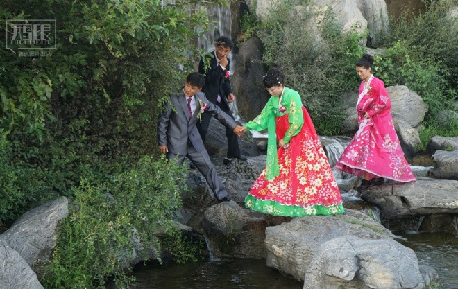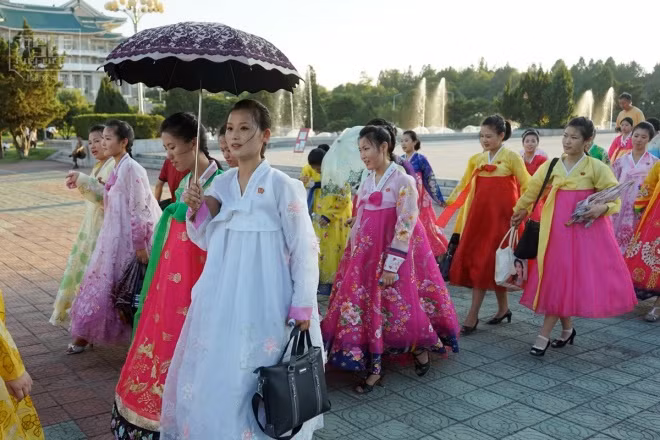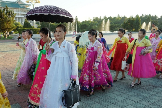 Các cô gái Triều Tiên mặc Joseon-ot, trang phục truyền thống của nước này, đi trên đường. Người dân Triều Tiên có câu "trai phương nam, gái phương bắc", ý chỉ vẻ đẹp của con gái Triều Tiên và con trai Hàn Quốc.