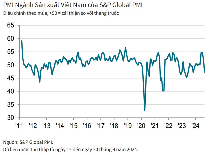 Chỉ số PMI ngành sản xuất Việt Nam của S&P Global đã giảm xuống dưới ngưỡng 50 điểm trong tháng 9, từ đó báo hiệu các điều kiện kinh doanh suy giảm trở lại vào thời điểm cuối quý III/2024, sau khi đã có một giai đoạn tăng trưởng mạnh. Chỉ số PMI giảm từ 52,4 điểm trong tháng 8/2024 xuống 47,3 điểm trong tháng 9/2024, cho thấy "sức khỏe" ngành sản xuất đã yếu đi đáng kể nhất kể từ tháng 11/2023.
