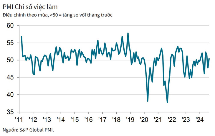 Những nhà sản xuất mua hàng trong tháng đã gặp phải tình trạng thời gian giao hàng của nhà cung cấp bị kéo dài đáng kể khi lũ lụt làm gián đoạn khâu vận tải. Kết quả là tồn kho hàng mua đã giảm nhanh. Hơn nữa, mức giảm này là mạnh thứ hai trong lịch sử chỉ số, chỉ kém mức của tháng 4/2020 -tháng chịu ảnh hưởng của đại dịch. Tồn kho hàng thành phẩm cũng giảm trong tháng 9/2024.