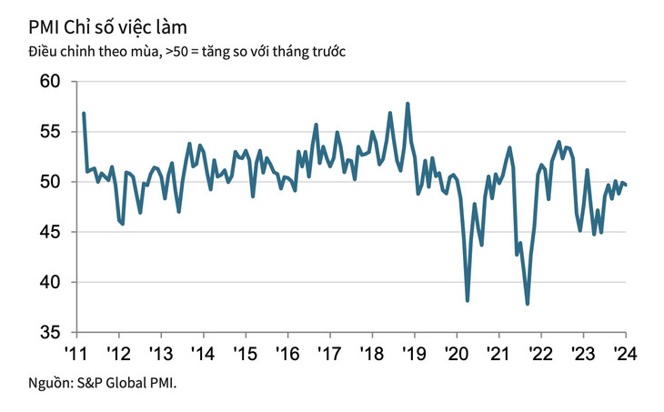 Với mức tăng của cả sản lượng và số lượng đơn đặt hàng mới đều là nhẹ, các công ty đã duy trì số lượng nhân viên và hoạt động mua hàng gần như không thay đổi vào tháng đầu năm 2024.