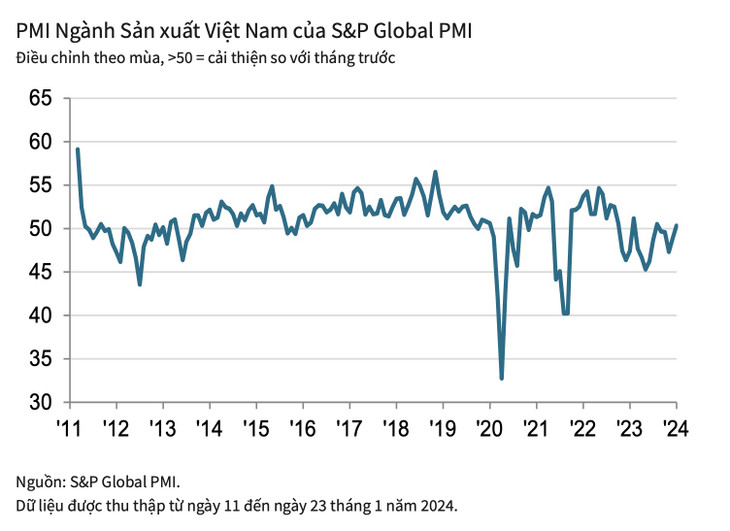 Chỉ số PMI ngành sản xuất Việt Nam của S&P Global quay trở lại trên ngưỡng 50 điểm trong tháng 1/2024, khi tăng lên mức 50,3 điểm so với 48,9 điểm của tháng 12/2023. Kết quả chỉ số cho thấy, "sức khỏe" của ngành sản xuất cải thiện lần đầu tiên trong 5 tháng, nhưng mức cải thiện lần này chỉ là nhỏ.