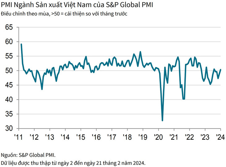 S&P Global cho biết, PMI ngành sản xuất Việt Nam đạt kết quả 50,4 điểm trong tháng 2/2024, tăng nhẹ so với 50,3 điểm của tháng 1/2024 và nằm trên ngưỡng 50 điểm tháng thứ hai liên tiếp. "Mức độ cải thiện sức khỏe ngành sản xuất thể hiện thông qua chỉ số vẫn chỉ là nhẹ", S&P Global nhận xét.