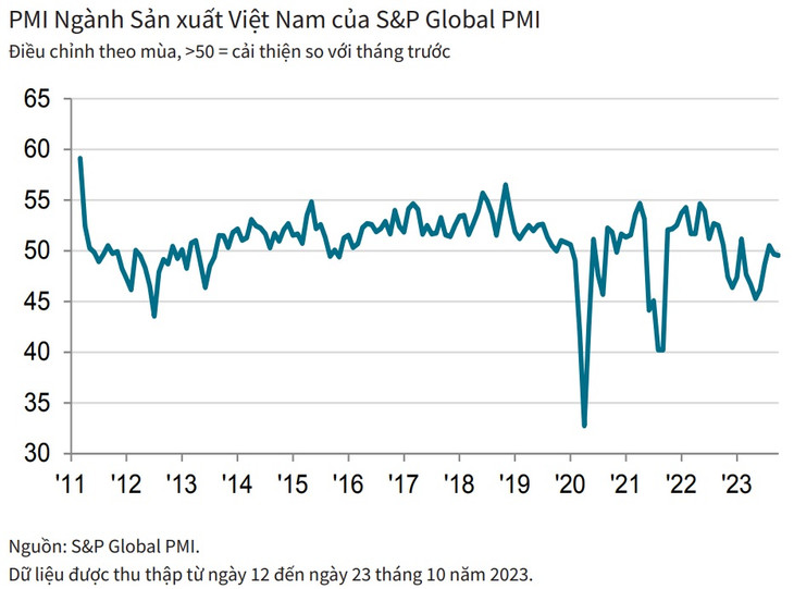 Theo S&P Global, các điều kiện kinh doanh tổng thể trong ngành sản xuất của Việt Nam đã suy giảm nhẹ trong tháng 10 khi các công ty tiếp tục giảm sản lượng mặc dù số lượng đơn đặt hàng mới tăng nhẹ. Điểm tích cực là việc làm đã ổn định sau thời kỳ suy giảm và các công ty tiếp tục gia tăng hoạt động mua hàng với tâm lý lạc quan về triển vọng trong năm tới.