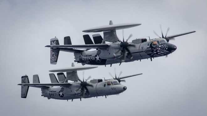 Máy bay cảnh báo sớm E-2C Hawkeye có trách nhiệm phát hiện mục tiêu từ xa, quản lý thông tin chiến trường và điều phối hoạt động của không đoàn tiêm kích trên hạm. Nó đóng vai trò như cảm biến cho vũ khí tầm xa của nhóm tàu sân bay, đồng thời cảnh báo về các mối nguy hiểm đối với hạm đội.