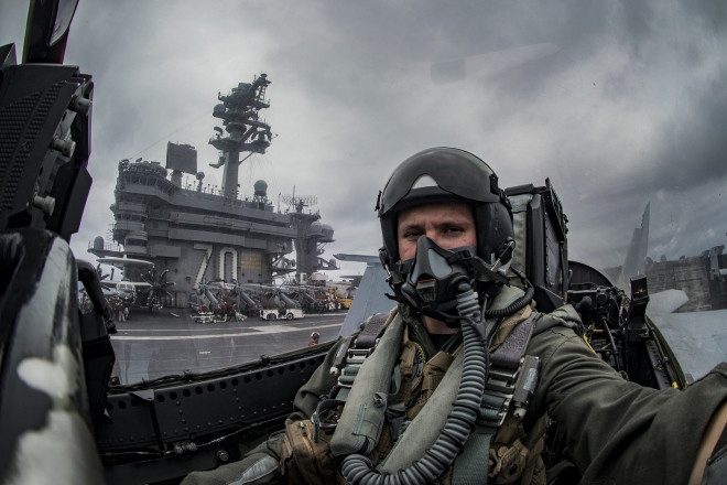Một phi công tiêm kích F/A-18E chuẩn bị cất cánh từ tàu sân bay USS Carl Vinson.