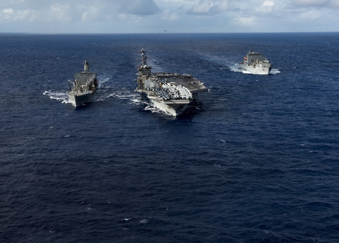 Trong ảnh, tàu USS Carl Vinson đang tiếp nhiên liệu và nhu yếu phẩm từ tàu hậu cần trước khi tới Biển Đông.