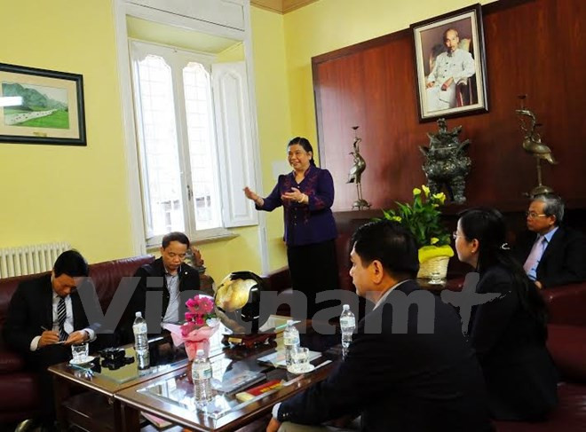 Trước đó, chiều 27/5, Phó Chủ tịch Quốc hội Tòng Thị Phóng và các thành viên trong đoàn công tác đã đến thăm và nói chuyện thân mật với cán bộ, nhân viên Đại sứ quán Việt Nam tại Italy, kiều bào và du học sinh Việt Nam đang sinh sống, học tập và làm việc tại Italy.