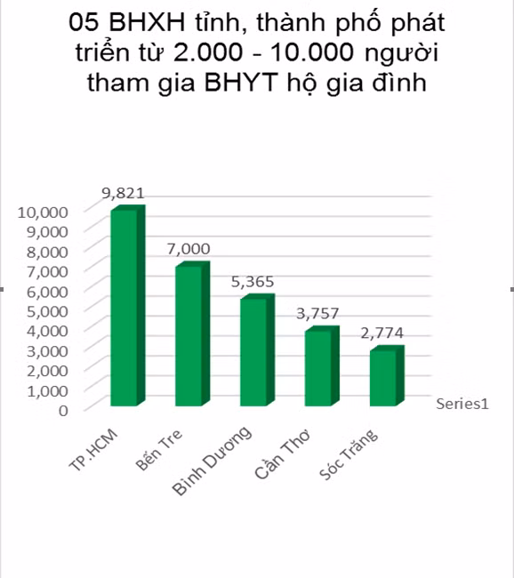 Về BHYT hộ gia đình, 07 BHXH tỉnh, thành phố phát triển từ 2.000 - 10.000 người tham gia, đó là: TP.HCM (9.821 người); Bến Tre (7.000 người); Bình Dương (5.365 người); Cần Thơ (3.757 người); Sóc Trăng (2.774 người); Thanh Hóa (2.396 người); Tiền Giang (2.351 người). 07 BHXH tỉnh, thành phố phát triển từ 1.000 - 2.000 người tham gia, đó là: Đồng Tháp (1.561 người); Hà Nội 1.509 người); Quảng Nam (1.391 người); An Giang (1.304 người); Trà Vinh (1.186 người); Bạc Liêu (1.174 người); Đắk Lắk (1.020 người). 13 BHXH tỉnh, thành phố phát triển từ 500- dưới 1000 người tham gia, đó là: Cà Mau 938; Long An 873; Vĩnh Phúc 772; Khánh Hòa 724; Quảng Bình 707; Tuyên Quang 689; Hậu Giang 678; Bắc Ninh 661; Hà Tĩnh 634; Lâm Đồng 616; Phú Yên 565; Quảng Ngãi 554; Phú Thọ 539.
