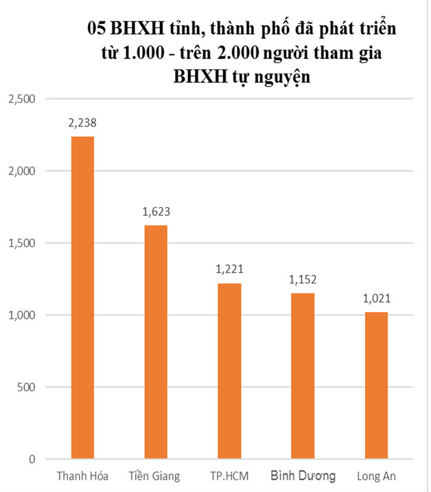 Cụ thể, về BHXH tự nguyện, 05 BHXH tỉnh, thành phố đã phát triển từ 1.000 - trên 2.000 người tham gia, như: Thanh Hóa (2.238 người); Tiền Giang (1.623 người); TP.HCM (1.221 người); Bình Dương (1.152 người); Long An (1.021 người). 19 BHXH tỉnh, thành phố phát triển trên 500 người tham gia, như: Thừa Thiên Huế (952 người); Trà Vinh (925 người); Lâm Đồng (902 người); Bến Tre (700 người); Quảng Ngãi (636 người); Cà Mau (635 người); Gia Lai (611 người); An Giang (608 người); Nghệ An (587 người); Cần Thơ (581 người); Hà Nội (579 người); Điện Biên (563 người); Đồng Nai (558 người); Hà Tĩnh (554 người); Phú Yên (533 người); Bình Thuận (532 người); Nam Định (525 người); Đồng Tháp (513 người); Phú Thọ (504 người).