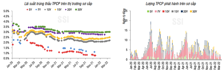 Theo Công ty Chứng khoán SSI dự báo, lợi suất trên thị trường sơ cấp sẽ nhích tăng trong thời gian tới khi áp lực huy động vốn từ Kho bạc Nhà nước tăng dần, đặc biệt từ việc triển khai gói hỗ trợ kinh tế 2022 - 2023.
