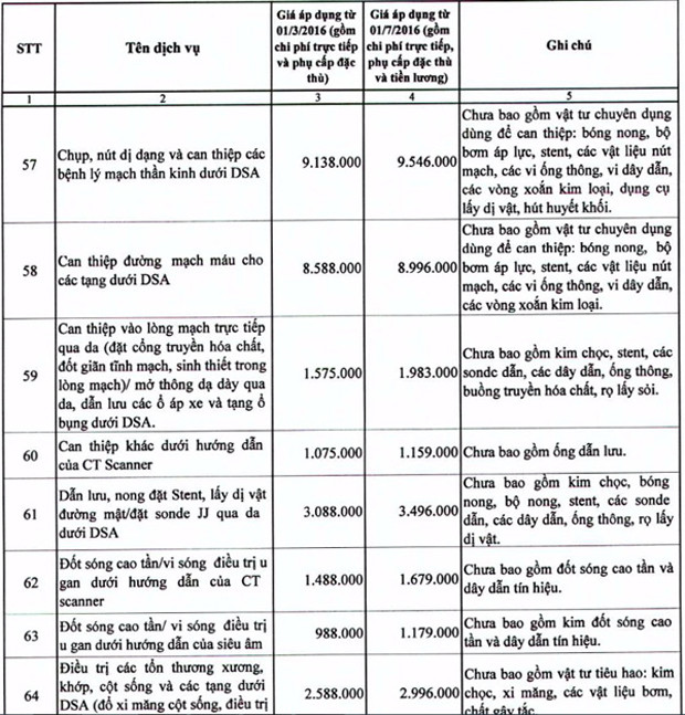 Tuy nhiên nhiều dịch vụ có mức thấp như siêu âm từ 30.000 lên 49.000 đồng, chụp X-quang thường từ 36.000 đồng lên 47.000 đồng, chụp và can thiệp tim mạch từ 6,3 triệu đồng lên 6,7 triệu đồng; chụp PET/CT từ 19,3 triệu đồng lên 20,1 triệu đồng...