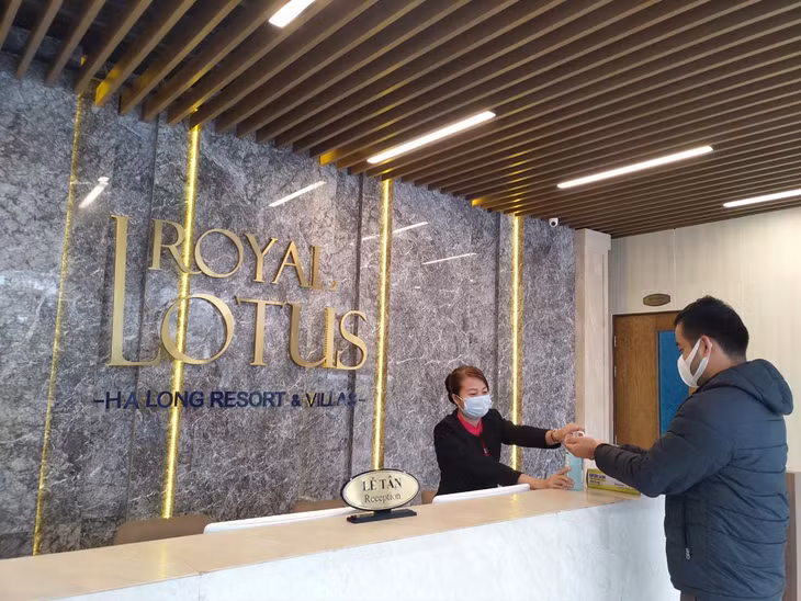 Nhân viên lễ tân của Royal Lotus Halong Resort & Villas hướng dẫn và tiến hành vệ sinh khử trùng tay cho du khách