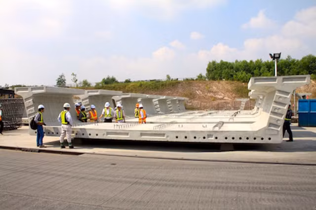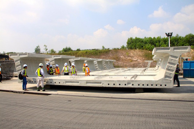 Tại bãi đúc dầm ở quận 9, để chở được một đốt dầm này ra công trường, một chuyên gia cho biết phải huy động cả trăm nhân công.
