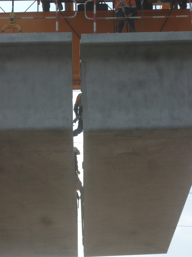 Dầm bắt đầu ráp nối. Đội ngũ công nhân không ngưng tay. Người tập trung đo đạt, người không rời mắt khỏi màn hình điều khiển...