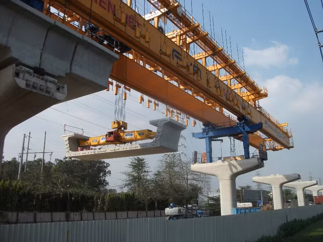 Đoạn dầm nặng hàng tấn được nhích từng milimet một trong quá trình lắp dầm kéo dài tuyến metro.