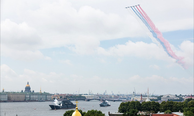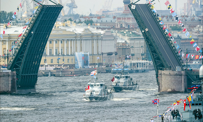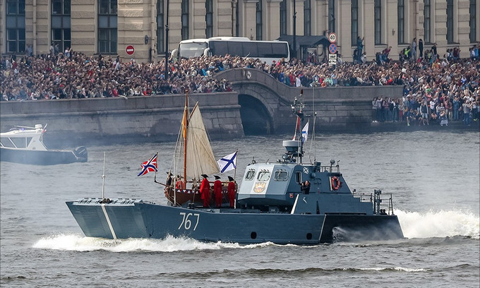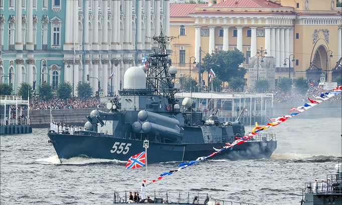 Cuộc duyệt binh kỷ niệm Ngày Hải quân Nga diễn ra hôm 30/7 trên sông Neva và khu vực Vịnh Phần Lan ngoài khơi thành phố St. Petersburg với sự tham gia của khoảng 50 tàu chiến và hơn 40 máy bay các loại, theo Livejournal.