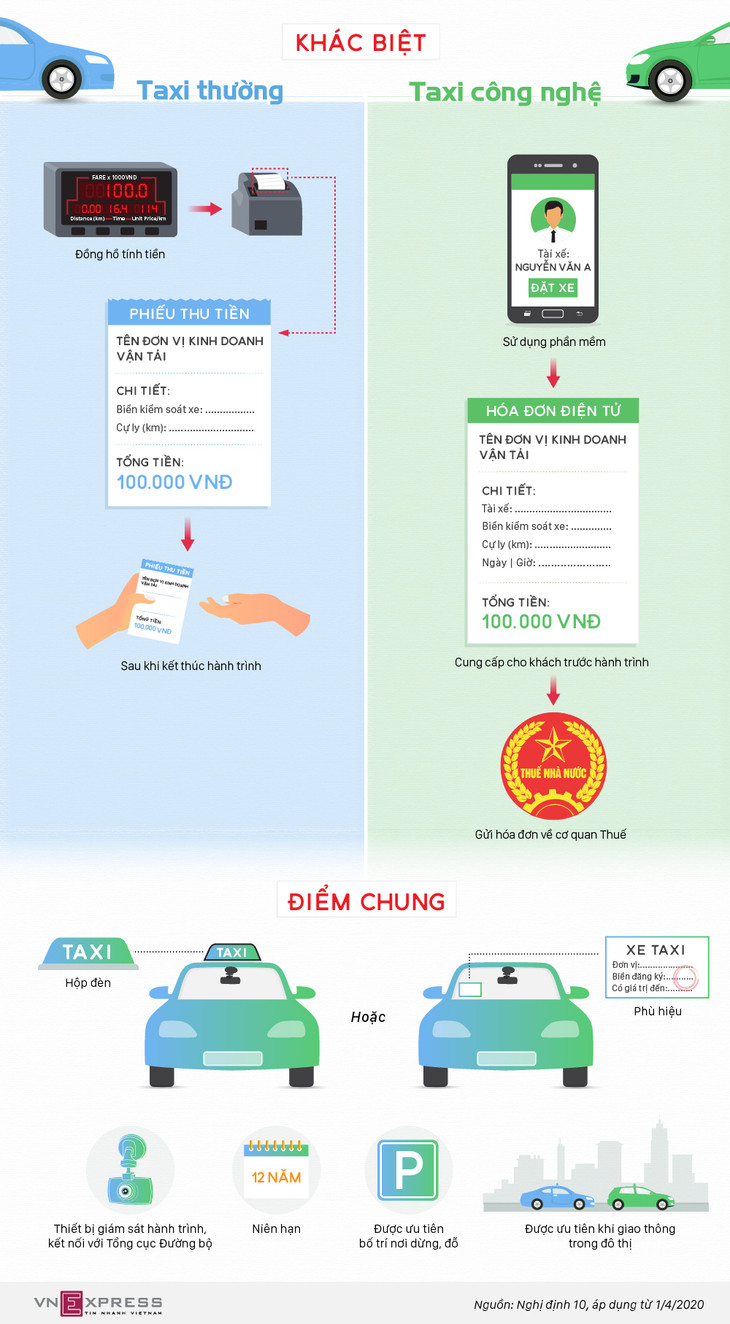 Taxi công nghệ và taxi truyền thống khác biệt về cách thức đặt xe, thanh toán, giống nhau về phù hiệu, ưu tiên nơi dừng, đỗ...