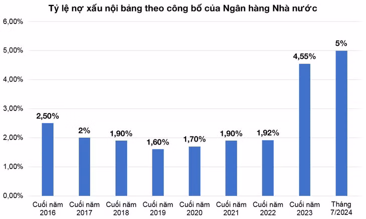 Theo đánh giá của Ủy ban Giám sát tài chính quốc gia, nợ xấu tăng phản ánh khó khăn của nền kinh tế. Đến cuối tháng 4/2024, giá trị nợ xấu đã tăng 24,1% so với cuối năm 2023 (cùng kỳ năm 2023 tăng 35,4%). 16/35 ngân hàng thương mại trong nước có giá trị nợ xấu tăng trên 30%, một số ngân hàng có tỷ lệ nợ xấu báo cáo vượt ngưỡng 3%.