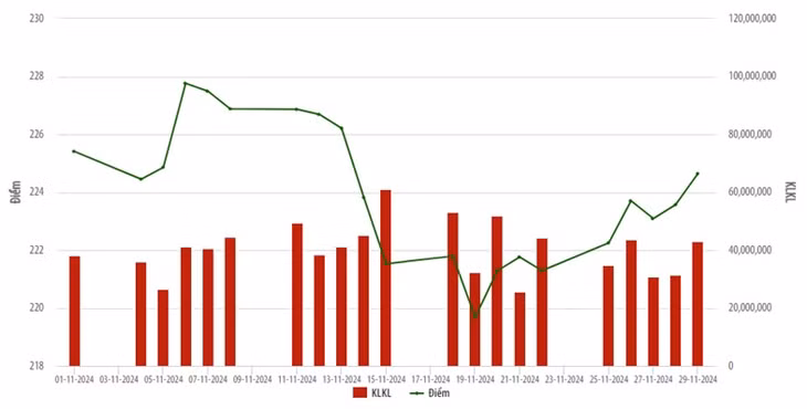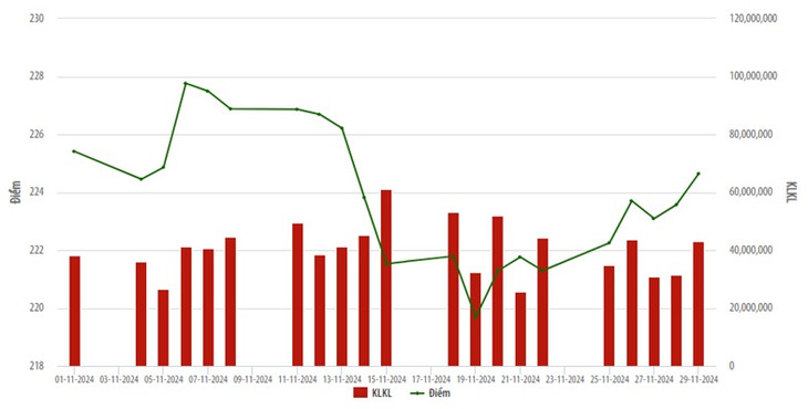 Chỉ số HNX Index sau khi giảm mạnh trong tuần giao dịch thứ 3 của tháng đã có xu hướng phục hồi trở lại và đóng cửa ở mức 224,64 điểm, giảm 0,75% so với tháng 10/2024. Thanh khoản trên thị trường giảm so với tháng trước. Khối lượng giao dịch (KLGD) bình quân của thị trường đạt 48,2 triệu cổ phiếu/phiên, giảm 11%; tương ứng giá trị giao dịch (GTGD) bình quân đạt 850,2 tỷ đồng/phiên, giảm 14,9%. Phiên giao dịch ngày 8/11/2024 được ghi nhận có KLGD cao nhất đạt 69,3 triệu cổ phiếu, tương ứng GTGD cao nhất đạt 1,23 nghìn tỷ đồng.