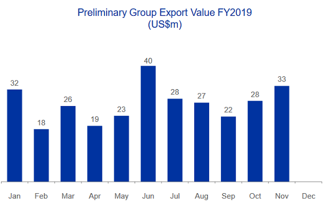 Lũy kế 11 tháng, doanh số xuất khẩu đạt 296 triệu USD, giảm 15% so cùng kỳ năm trước.