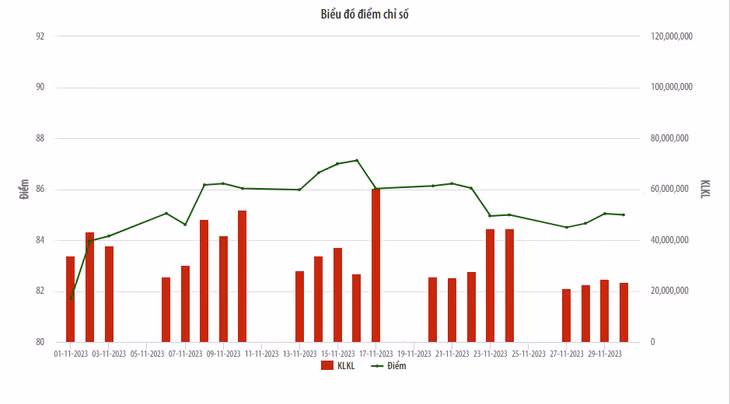 Mặc dù Chỉ số UPCoM-Index tăng 5,02%, đóng cửa tháng 11/2023 tại mức 84,99 điểm, song thanh khoản thị trường lại có xu hướng giảm. Khối lượng giao dịch bình quân giảm 7,71%, đạt xấp xỉ 41,01 triệu cổ phiếu/phiên, giá trị giao dịch bình quân giảm 12,22% so với tháng 10/2023, đạt hơn 572 tỷ đồng/phiên.