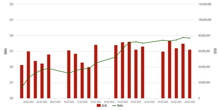 Chỉ số HNX Index đóng cửa ở mức 239,19 điểm, tăng 7,25% so với tháng 1/2025. Khối lượng giao dịch (KLGD) bình quân đạt 65,4 triệu cổ phiếu/phiên, tăng 37% và giá trị giao dịch (GTGD) bình quân đạt 1.063,1 tỷ đồng/phiên, tăng 40% so với tháng trước. Trong đó, phiên giao dịch ngày 19/2/2025 được ghi nhận có KLGD và GTGD cao nhất tháng với 97,4 triệu cổ phiếu tương đương 1,61 nghìn tỷ đồng được giao dịch.