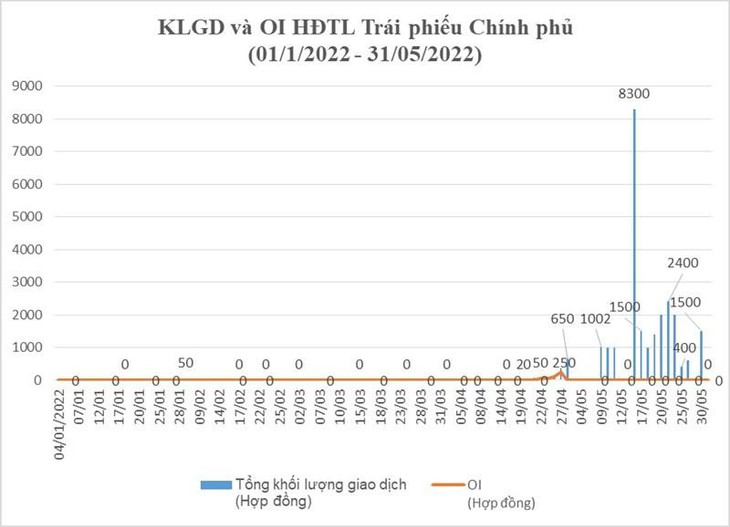 Trong tháng 5, hợp đồng tương lai trái phiếu chính phủ kỳ hạn 10 năm và 5 năm đều có giao dịch trở lại sau thời gian dài, khối lượng giao dịch hợp đồng tương lai trái phiếu chính phủ kỳ hạn 10 năm là 2.000 hợp đồng và hợp đồng tương lai trái phiếu chính phủ kỳ hạn 5 năm là 22.102 hợp đồng, tổng giá trị giao dịch theo danh nghĩa đạt 41.430 tỷ đồng. Khối lượng OI hợp đồng tương lai trái phiếu chính phủ tại thời điểm 31/05/2022 là 0 hợp đồng.