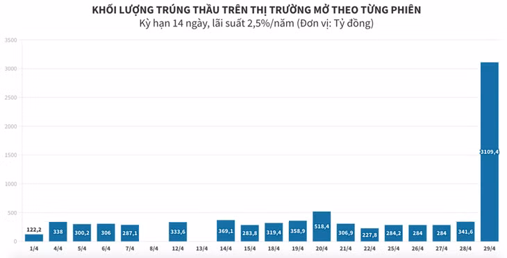 Tuy nhiên, trong phiên 29/4, lượng trúng thầu đã tăng vọt lên 3.109 tỷ đồng. Đây cũng là phiên bơm ròng duy nhất trong tháng 4 thị trường đón nhận thêm lượng tiền lớn như vậy.
