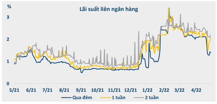 Trong khi đó, tăng trưởng tín dụng (tới ngày 31/3/2022) đạt 5,04%, mức cao nhất trong 10 năm qua. Tín dụng tăng mạnh đã khiến cho thanh khoản hệ thống ngân hàng có phần căng thẳng hơn và phải liên tục sử dụng tới kênh OMO để bơm tiền ngắn hạn ra ngoài hệ thống sau gần kênh này 1 năm đóng băng.