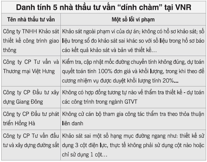 Theo Kết luận thanh tra số 1849/BGTVT-TTr của Bộ GTVT, có 8 nhà thầu tư vấn tham gia dự án nêu trên, ở các khâu: lập báo cáo kinh tế - kỹ thuật (5 nhà thầu), thẩm tra thiết kế - dự toán (3 nhà thầu). Trong đó, 2 nhà thầu tư vấn khảo sát, thiết kế có nhiều tồn tại, sai phạm là Công ty TNHH Khảo sát thiết kế công trình giao thông, Công ty CP Tư vấn và Thương mại Việt Hưng.