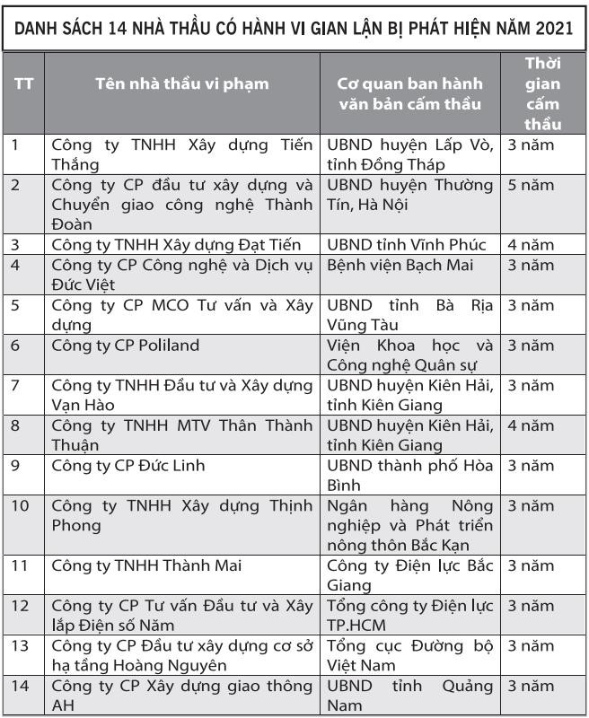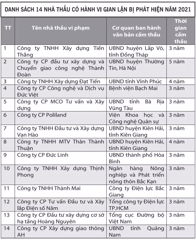 Theo phân tích của chuyên gia đấu thầu, trong số các nguyên nhân dẫn đến việc các nhà thầu bị liệt kê vào danh sách vi phạm, phải đăng tải công khai trên Hệ thống mạng đấu thầu quốc gia thì việc thông đồng, móc ngoặc và gian lận trong đấu thầu là hành vi đáng lên án nhất. Kết quả thống kê của phóng viên Báo Đấu thầu cho thấy, trong số 64 nhà thầu có tên trong các quyết định xử lý vi phạm của các chủ đầu tư, cấp có thẩm quyền năm 2021, có 14 nhà thầu bị cấm thầu 3 - 5 năm do cung cấp thông tin không trung thực, là hành vi bị cấm trong đấu thầu theo quy định tại Điểm c Khoản 4 Điều 89 Luật Đấu thầu.