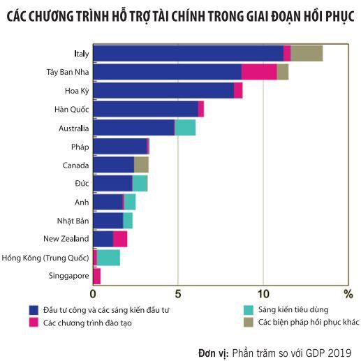 Theo đó, nước Mỹ dự kiến sẽ có chương trình hỗ trợ tài chính quy mô lớn trong giai đoạn phục hồi, với quy mô tương đương 9% GDP, tập trung vào đầu tư kết cấu hạ tầng và thời gian kéo dài hơn một thập kỷ. Trong khi đó, các thành viên Liên minh châu Âu sẽ triển khai một chương trình kết hợp giữa bảo lãnh và cho vay, với thời gian vào khoảng 2021- 2026. Quy mô của chương trình có thể tương đương 5% GDP của EU. Với một số nền kinh tế nhỏ hơn khác, các chương trình hỗ trợ tài chính trong giai đoạn hồi phục sẽ có quy mô vào khoảng 6% GDP năm 2019 - thời điểm trước khi đại dịch Covid-19 xuất hiện.