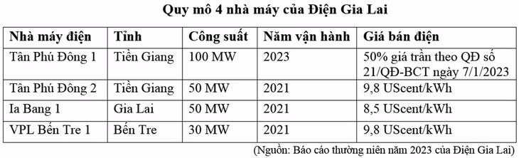 Góp mặt trong danh sách này có 4 nhà máy điện thuộc sở hữu của Công ty CP Điện Gia Lai, gồm Nhà máy Điện gió Tân Phú Đông 1, Nhà máy Điện gió Tân Phú Đông 2, Nhà máy Điện gió Ia Bang 1, Nhà máy Điện gió VPL Bến Tre với tổng công suất 230 MW. Trong đó, Nhà máy Điện gió Tân Phú Đông 1 có công suất lớn nhất (100 MW) mới được vận hành vào năm 2023, tổng mức đầu tư 4.464 tỷ đồng.