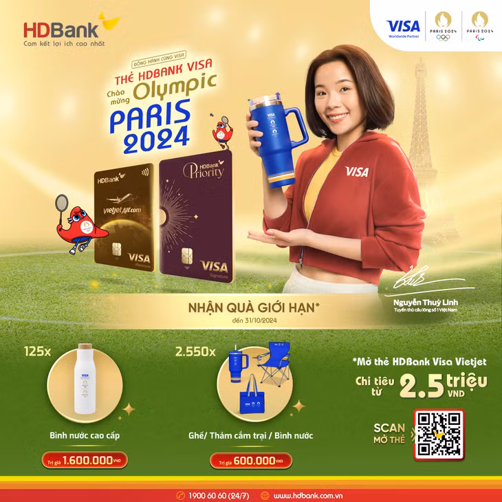 Với chương trình“Thẻ HDBank Visa Chào Mừng Thế Vận Hội 2024” và ưu đãi hoàn tiền khi mua vé máy bay Vietjet, khách hàng của HDBank sẽ được hưởng hai lần ưu đãi vượt trội. Đây là dịp không thể bỏ lỡ để khách hàng vừa nhận được những phần quà giới hạn hấp dẫn, vừa tiết kiệm chi phí tận hưởng các chuyến du lịch và công tác.
