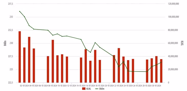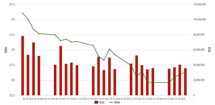 KLGD bình quân của thị trường đạt 54,2 triệu cổ phiếu/phiên, giảm 5,7%, tương ứng GTGD bình quân đạt 999,5 tỷ đồng/phiên, giảm 8,46%. Phiên giao dịch ngày 1/10/2024 được ghi nhận có KLGD cao nhất đạt 126,2 triệu cổ phiếu, tương ứng GTGD cao nhất đạt 2,28 nghìn tỷ đồng.