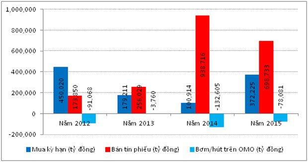 Tính đến cuối năm 2015, dư nợ tín phiếu NHNN đã bằng 0 và NHNN đang điều hành bơm hút tiền qua OMO chỉ thông qua nghiệp vụ Mua kỳ hạn (Reverse Repo). Tính chung trong năm 2015, tổng lượng tiền NHNN hút qua OMO là hơn 78.000 tỷ đồng đối với cả hai nghiệp vụ Mua kỳ hạn và Bán tín phiếu.