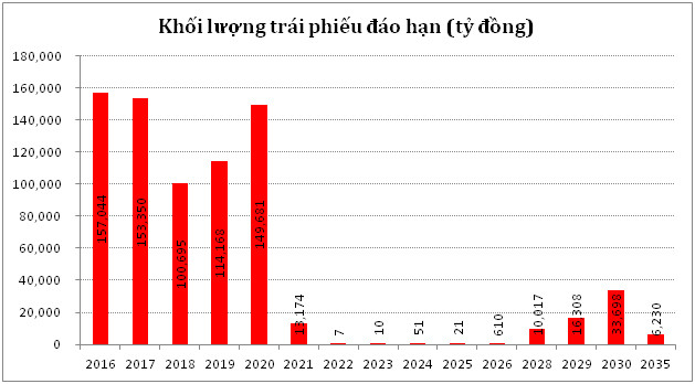 Đỉnh nợ đáo hạn TPCP liên tiếp trong 2 năm tới. Việc phát hành rất lớn TPCP kỳ hạn 2 năm và 3 năm giai đoạn trước nên trong 2 năm liên tiếp (2016 và 2017), khối lượng TPCP đáo hạn rất lớn. Trong bối cảnh tăng trưởng tín dụng có xu hướng tăng, các ngân hàng có khả năng ưa thích việc cho vay hơn đầu tư TPCP, tác động của quy định hạn chế tỷ lệ đầu tư vào TPCP của các TCTD trên nguồn vốn ngắn hạn tại Thông tư số 36/2014/TT-NHNN và một khối lượng lớn TPCP đáo hạn trong năm 2016 đặt ra những thách thức không nhỏ trong huy động vốn và cân đối thu chi NSNN.