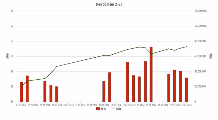 Chỉ số UPCoM Index có xu hướng tăng dần từ đầu tháng và đóng cửa phiên giao dịch cuối tháng đạt mức cao nhất là 90,63 điểm, tăng 3,1% so với cuối tháng 1/2024. Khối lượng giao dịch (KLGD) bình quân đạt xấp xỉ 51,48 triệu cổ phiếu/phiên, tăng 5,19% so với tháng 1/2024, tương ứng giá trị giao dịch (GTGD) bình quân đạt hơn 843 tỷ đồng/phiên, tăng 17,46%. Trong đó, phiên giao dịch ngày 19/2/2024 có thanh khoản lớn nhất với 135 triệu cổ phiếu được giao dịch, GTGD đạt hơn 2.695 tỷ đồng.