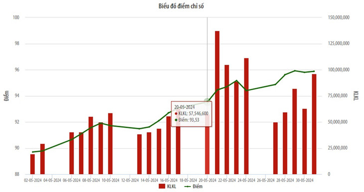 Trong đó, phiên giao dịch có KLGD cao nhất tháng đạt 205,5 triệu cổ phiếu tại ngày 22/5/2024, phiên có GTGD cao nhất tháng với hơn 3.051 tỷ đồng thuộc về phiên giao dịch ngày 30/5/2024. Chỉ số UPCoM Index đóng cửa tháng 5/2024 đạt 95,88 điểm, tăng 8,02% so với cuối tháng 4/2024.