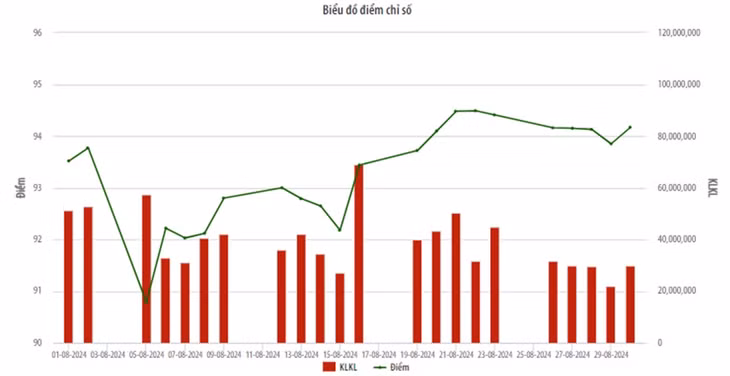 Chỉ số UPCoM Index đóng cửa tháng 8/2024 đạt 94,17 điểm (giảm 0,95%), khối lượng giao dịch (KLGD) bình quân đạt hơn 46,06 triệu cổ phiếu/phiên (giảm 19,33%), giá trị giao dịch (GTGD) bình quân đạt hơn 796 tỷ đồng/phiên (giảm 29,42%). Phiên giao dịch ngày 2/8/2024 ghi nhận mức KLGD và GTGD cao nhất tháng với KLGD đạt gần 84 triệu cổ phiếu và GTGD đạt hơn 1.306 tỷ đồng.