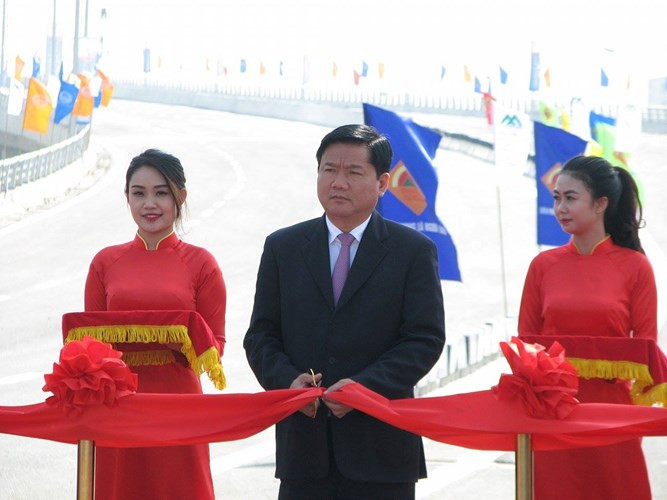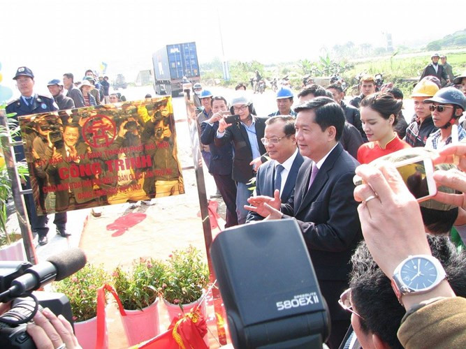 Bộ trưởng Bộ Giao Thông Vận Tải Đinh La Thăng tới dự và cắt băng thông xe cầu vượt thép lớn nhất Việt Nam.